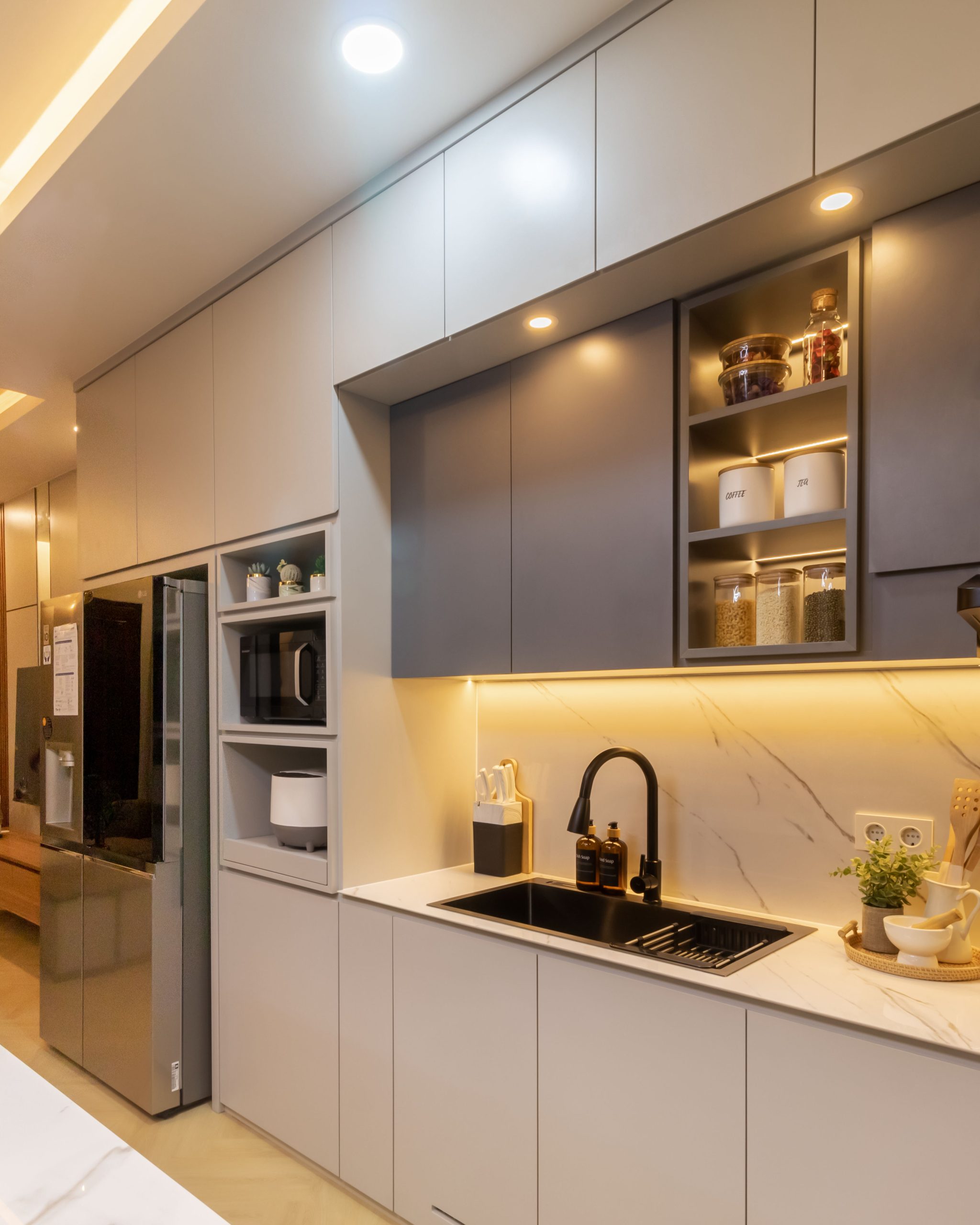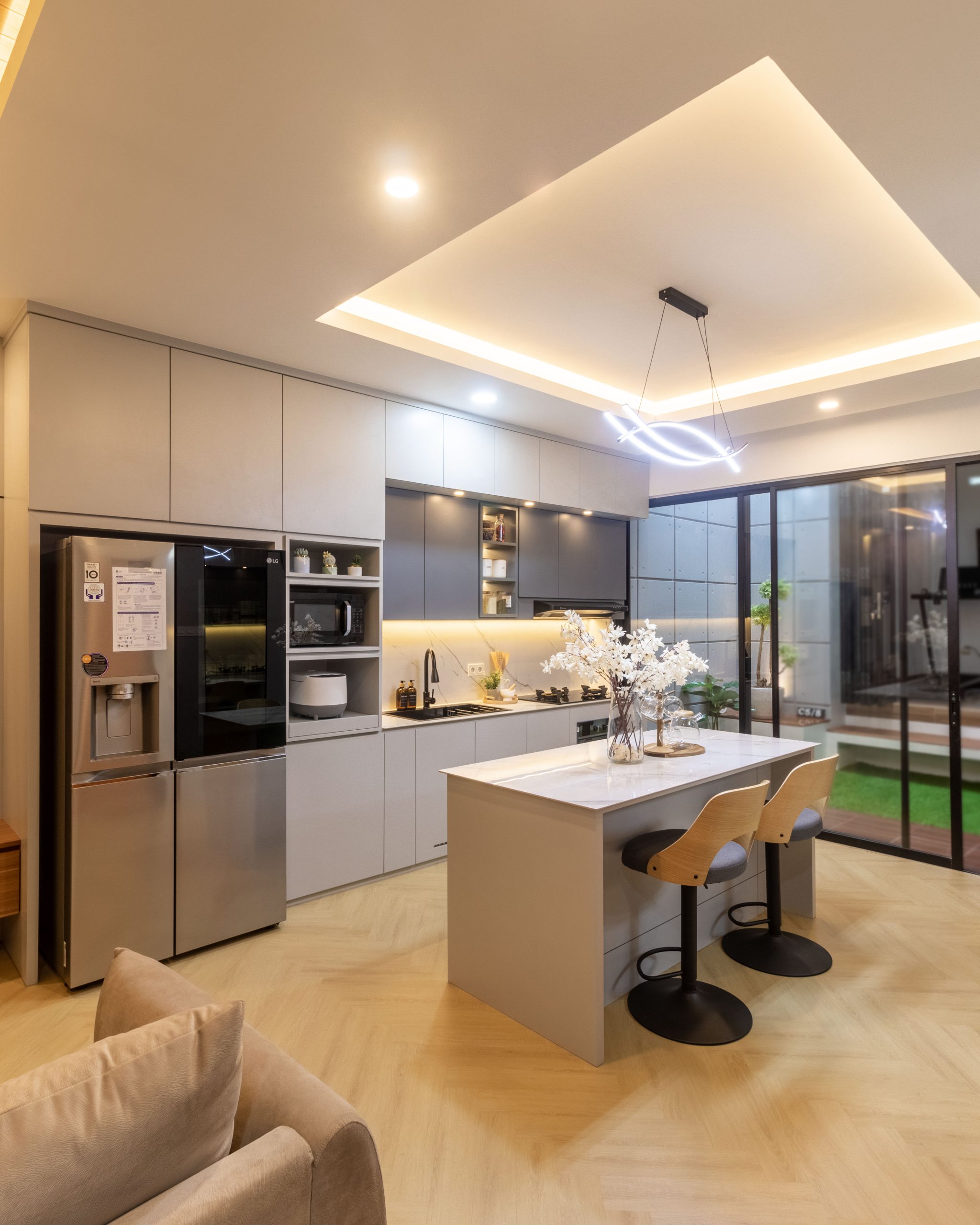 Clean, open, and connected. Living & kitchen set dalam satu ruang terbuka memberikan kenyamanan dan kepraktisan hidup masa kini. Konsep open space ini menyatukan area dapur dan ruang keluarga dalam harmoni yang modern dan fungsional. Lebih dekat, lebih hangat, lebih stylishÂ
