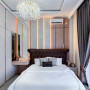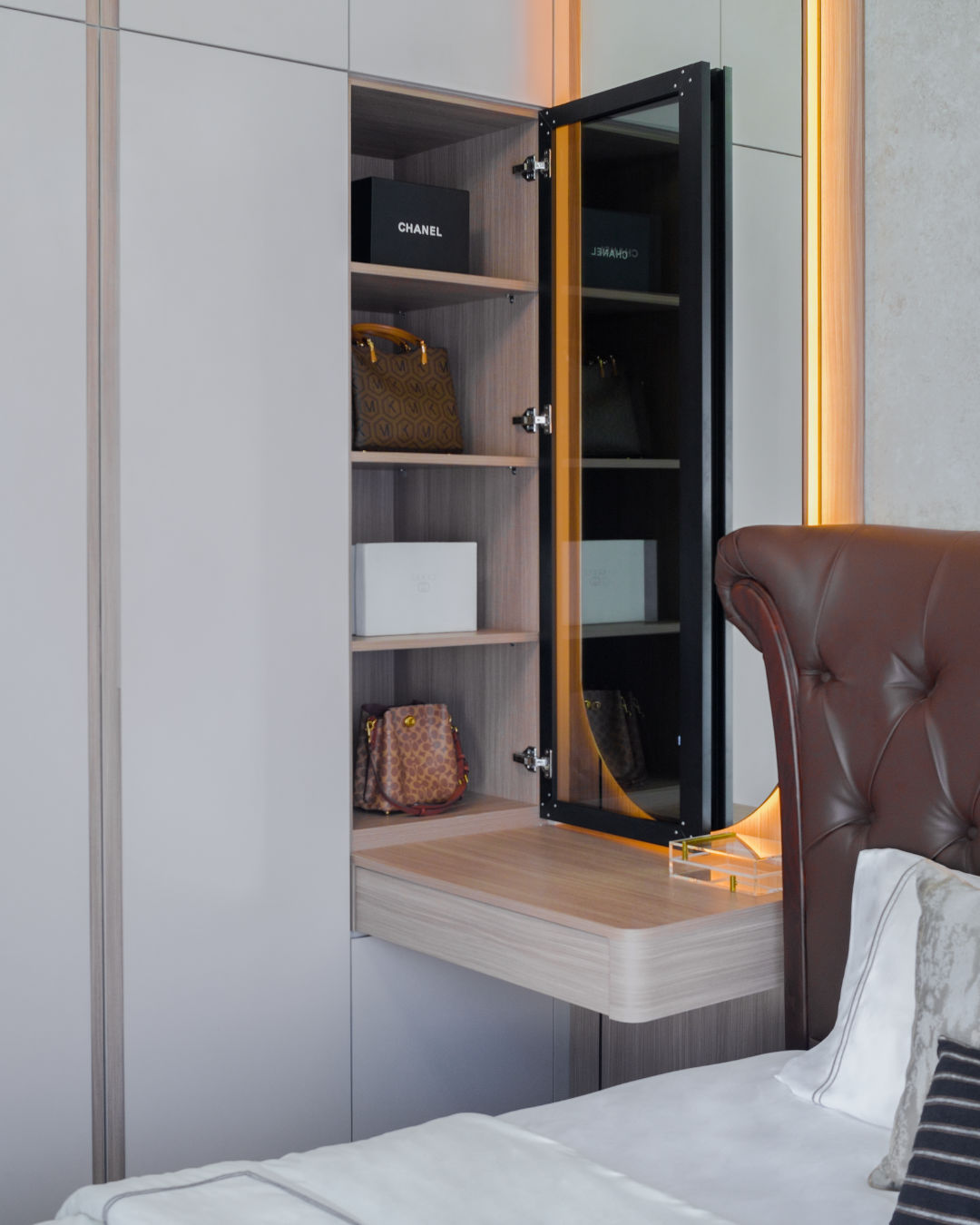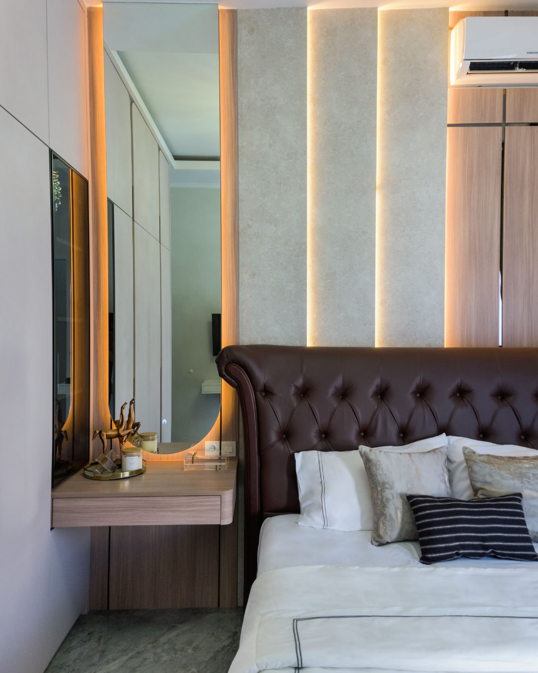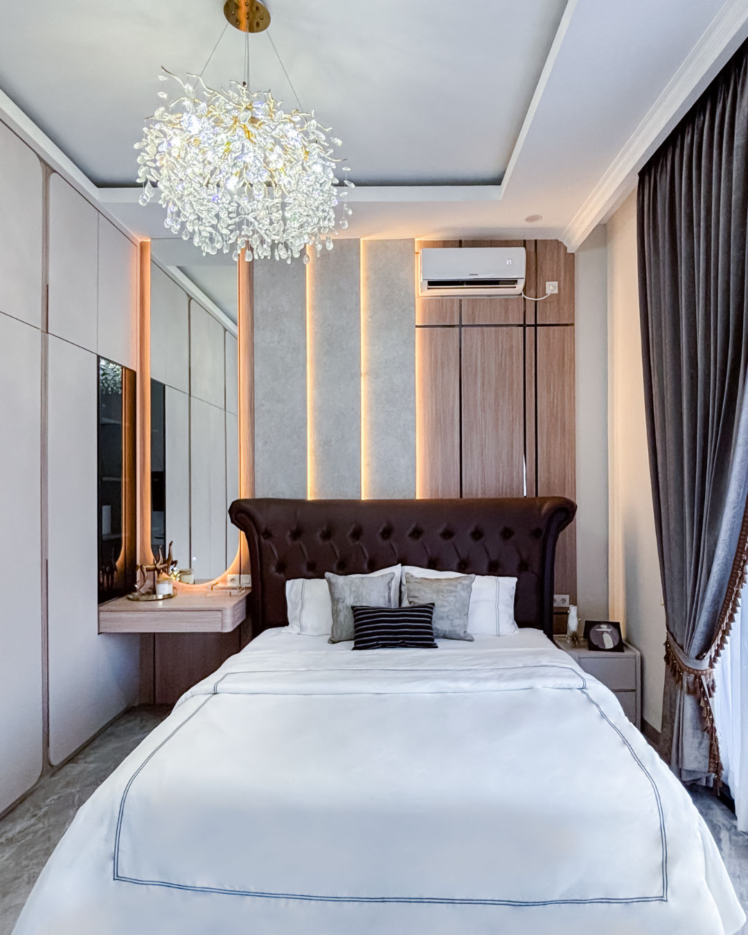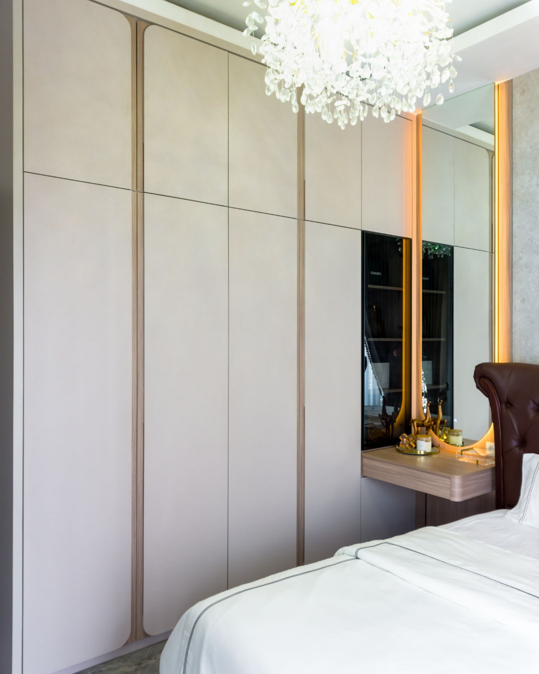 Master bedroom ini punya wardrobe dengan desain handleless sehingga terlihat clean dan seamless. Satu statement piece yang membuat kamar ini tidak hanya fungsional tapi juga elegan, perpaduan sempurna antara fungsi & estetika